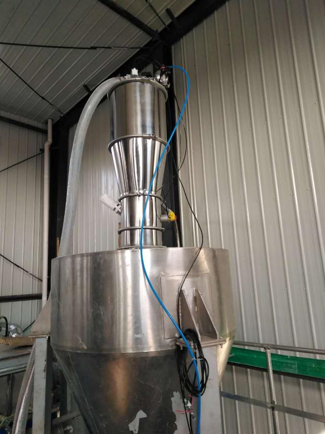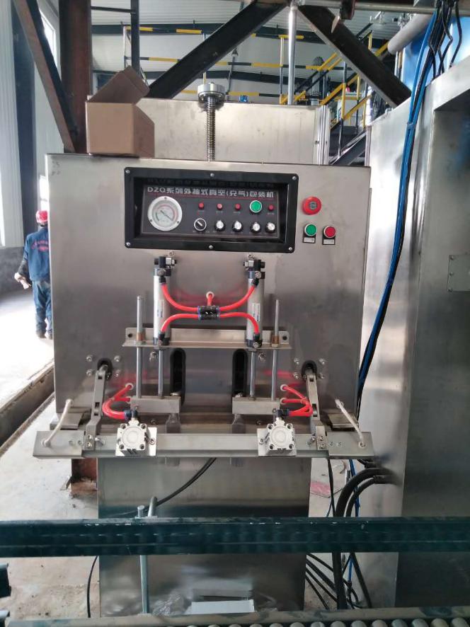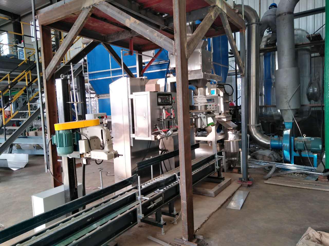 集料分配裝置接收干燥機組的出料,經加速室由負壓氣力輸送系統輸送至緩存料倉,再通過分料器為包裝機供料,包裝機采用特殊夾袋機構,配合除塵系統避免揚塵。抽真空熱合機和縫包機對滿袋物料進行密封封口,配合變頻皮帶輸送機協同輸送包裝袋。此套儲運、包裝系統在滿足用戶生產需要,提供自動化的同時,又大大改善了操作環境。受到客戶的高度贊揚。